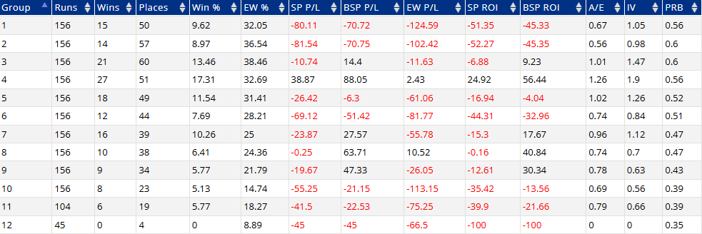 Group Runs Wins Places Win % EW % SP P/L BSP P/L EW P/L