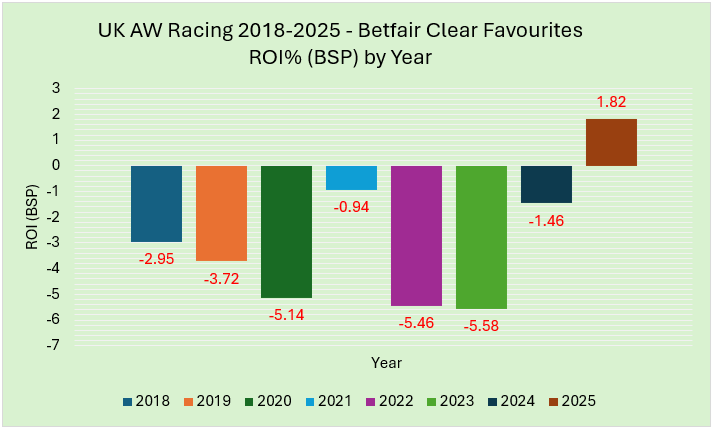 The data for this article relates to UK AW Racing from 2018 to 2025 inclusive. Profits have been calculated to Befair Starting Price (BSP) with returns adjusted for 2% commission. I am using Betfair Exchange favourites (clear favourites only) for this so let me start by showing the results for all such AW market leaders in the eight-year study period: