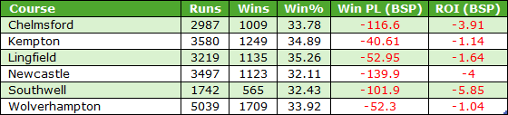 The Southwell stats are based on tapeta races, so only since the change of surface; it seemed to make no sense to combine the fibresand results with them as they are no longer relevant. Southwell’s stats are the worst for favourites with losses edging close to 6p in the £. Wolverhampton has been the happiest hunting ground for jollies closely followed by Kempton.