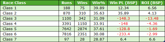 My initial theory for why favourites performed poorly in this class was that is may just be down to variance, but I back checked the 2010 to 2017 Class 3 results and noted that they produced similar overall losses (11p in the £). I cannot come up with a logical reason why favourites have struggled in these particular races, but the long-term stats suggest that this has been the case.