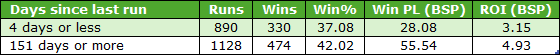 Hence favourites having a very recent run, or one coming back off a break of 5 months or more have performed above the norm.