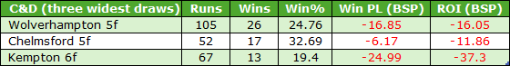 I wondered how well favourites fared from the poorest draws, although I knew that data for specific course and distance combinations was going to be limited. What I wanted to know is how favourites fared when berthed in one of the three widest draws at Kempton over 6f, Wolves over 5f and Chelmsford over 5f. I currently perceive these three track/trip combos to offer the strongest AW biases - and, from a positive perspective, to inside draws, I should add. I looked at handicaps only as they offer the most robust results as far as draw data is concerned.