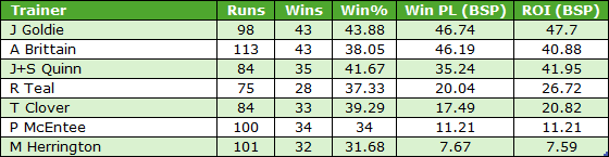 It is nice to see some different trainers appearing and indeed it makes sense that less familiar names would show up when looking in such an obvious place as market leaders. Jim Goldie tops the chart with an outstanding 1.50 A/E index and all seven on the chart have unsurprisingly been blindly profitable as the table below shows: