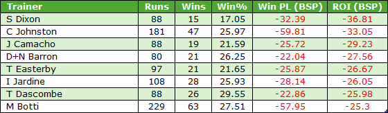 Not all trainers have done well when saddling the market leader, though. The table below shows the handlers that had recorded losses of more than 25p in the £ (again 75 runs minimum to qualify).