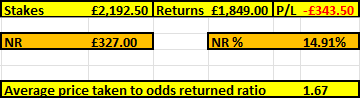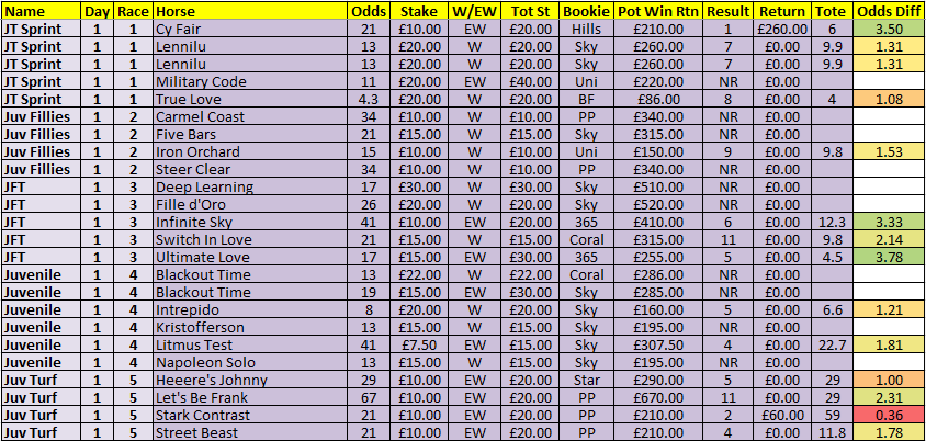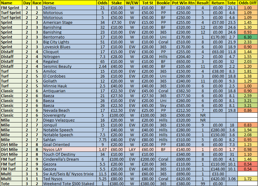 A difficult punting day but not a massive disaster, mainly on account of there only being five of the 14 races staged that day! Here was my tale of the punting tape. The odds differential column on the right hand side compares the price taken with the US return. A number bigger than 1 means the price taken beat the returned price. This is for guidance only because there are lots of white spaces where the non-runners appear. Waaaay too many non-runners on Juvenile Friday.