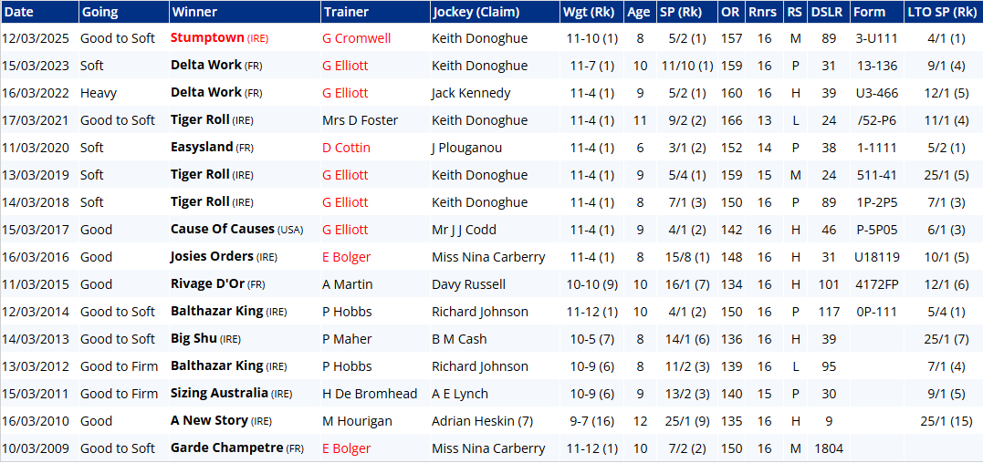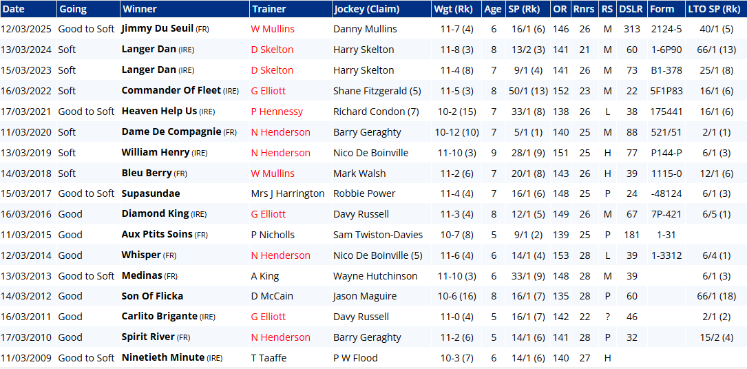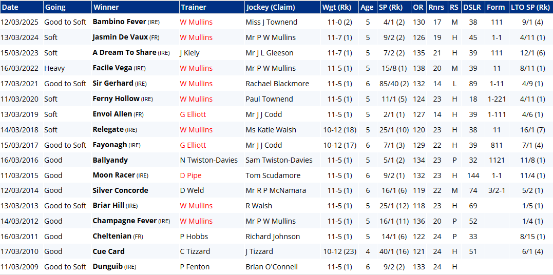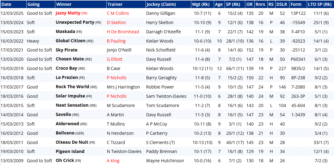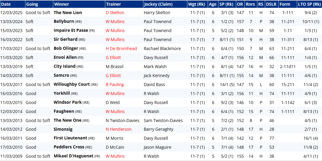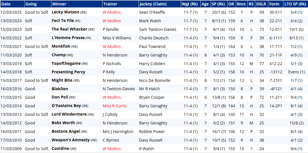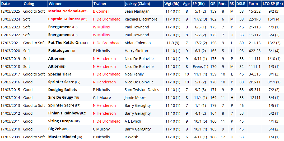 But therein might lie Majborough's Achilles heel: he can be a clumsy leaper. That was by no means his first mistake in the Arkle, though to give him his dues he's been much better this season, and was foot perfect last time out at DRF. He brings unarguably the strongest form and is easily the most likely winner. A look at the trends below, however, provides sobering reading for bridge jumpers: six winning jollies since 2009 (17 years) doesn't sound so bad until you consider that Jonbon was 2nd at 5/6 last year, El Fabiolo pulled up at 2/9 the year before, Shishkin was pulled up at 5/6, Chacun Pour Soi was 3rd at 8/13, Defi Du Seuil was 4th at 2/5, Douvan was 7th at 2/9, Un De Sceaux was 2nd at 4/6, Sizing Europe was 2nd at 4/5, and Master Minded was 4th at 4/5. Jeez!