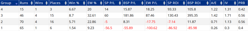 - Horses that have raced once or fewer at Cheltenham previously have combined to win just 4 races from 149 qualifiers for huge BSP losses of £92.62 (ROI -62.2%).