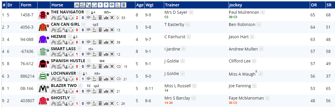 Chairmanoftheboard isn't the only one dropping in from Class 2, though, as the other two runners, Silver Samurai and Hierarchy, from the top three in the weights both make the same step down. Three (Tiger Crusade, Spring Bloom & bottom weight Sir Oliver) ran at this level last time out, but Bernardo O'Reilly, Justcallmepete, Priscilla's Wish and the returning Coco Bear all step up from Class 4.