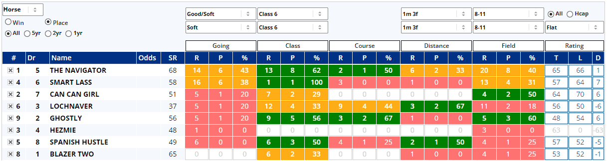 Instant Expert suggests that good to soft ground might not be the ideal metier for him from a win perspective, but he wouldn't want it any quicker than this and the same report shows how poor Spring Bloom's record is at this trip...