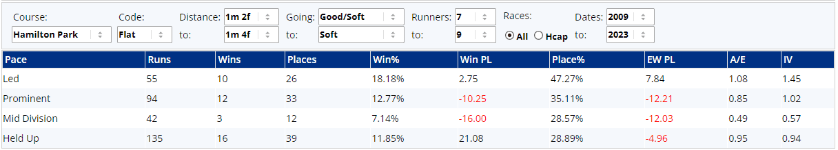 ...but over a straight 6f on what should be one of the best tracks in the country, I still think that any advantage wouldn't be that pronounced and that we should read more into how those races above have been won and our pace analyser says that half of those who lead go on to make the frame and that 1 in 5 leaders win with the general advice being to race as far forward as you can...