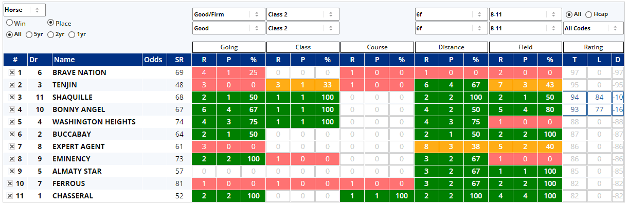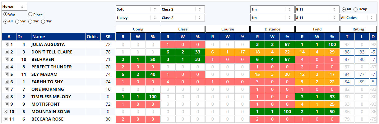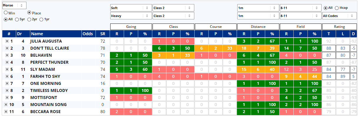 That's because it has the ability to condense the entire form profile of every runner in the race into a single, easily digestible, view. The report covers the form in terms of wins (or places), runs, and win (or place) percentage for each of going, class, course, distance, and field size. It also compares today’s official rating with the horse’s last winning official rating. The display is colour coded: green for a higher percentage rate, amber for a middling percentage, and red for a low percentage. Horses with no form under a certain condition have grey figures.