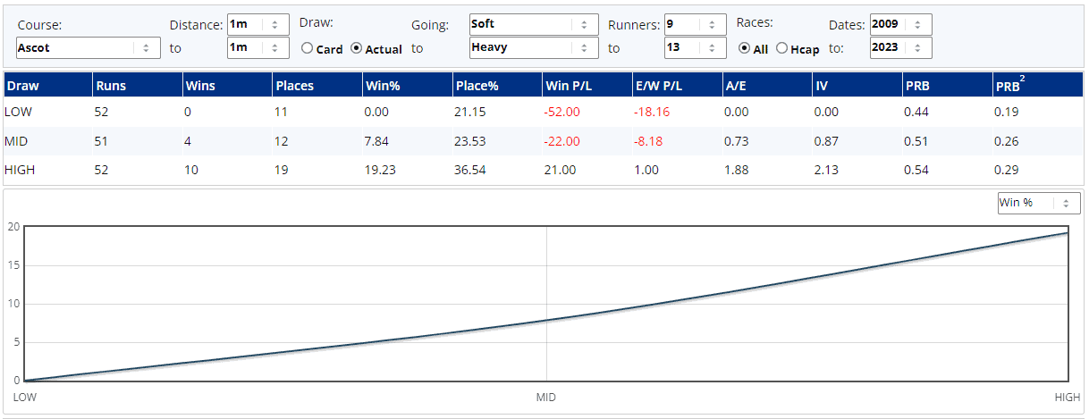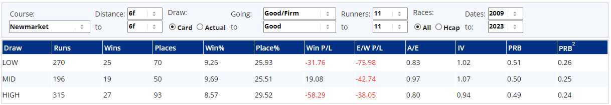 Our 100% placers Free Wind and Sea Silk Road are drawn in stalls 6 and 3 respectively here and the last five renewals of this race have been won by horses coming out of the first two stalls, but more generally here at York over this going/trip, there's not a huge draw bias...