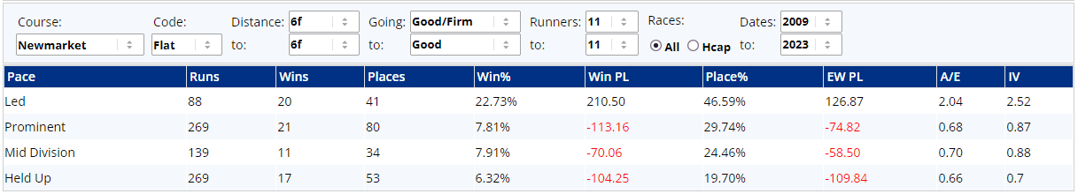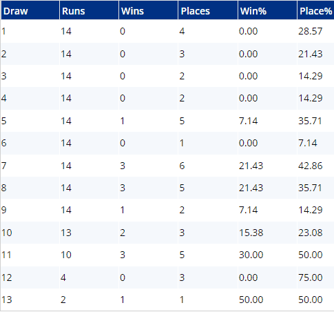 ...although there is a suggestion that stalls 7 & 8 might be the place to be, which would be good for the likes of Toskana Belle and Rogue Millennium if the race was run to suit them, of course. Those races aboive also don't have a huge pace bias either, but leaders have come out worse than any other running style...