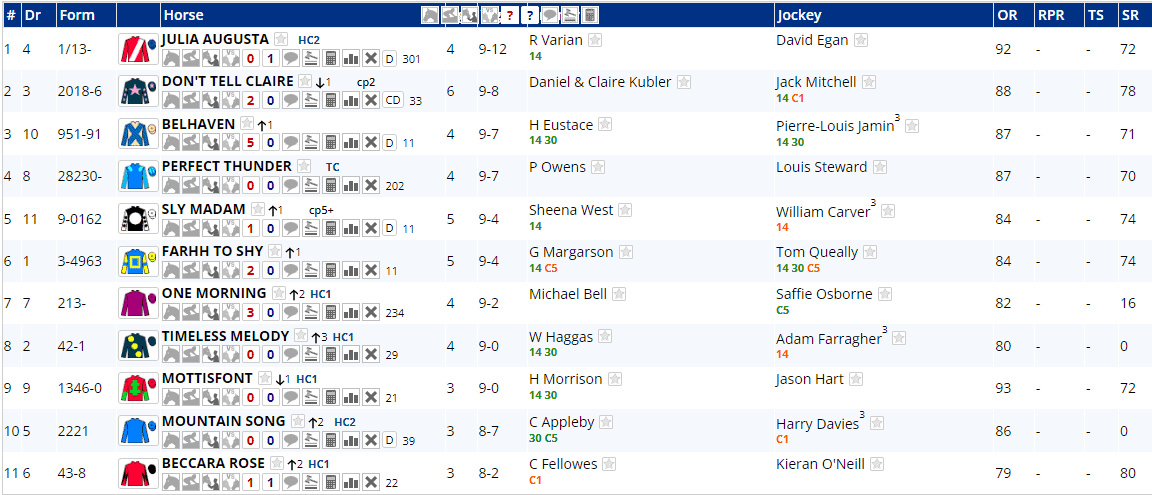 LTO winner Aristia has won over track and trip before and I'd expect her and possibly Sea Silk Road to be the ones chasing the fav home, but you'd probably guess that from the fact they're next best in the market at 5/1 and 11/2. In fairness, the top 3 in the market do sometimes finish 1-2-3 and I'd not be hugely surprised if that happened here, but if you were looking for something a bit longer at an E/W price, you can get 8's about the French filly, Toskana Belle.