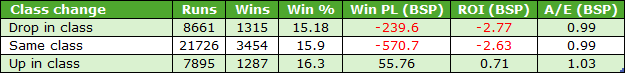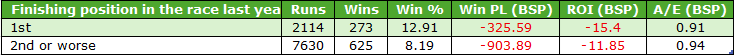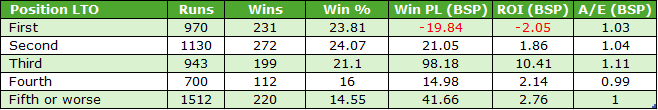 Leaders' place percentage was comfortably the best too, with 47.6% of early leaders still in the frame at the finish line; while their A/E index of 1.39 indicates that front runners were very good value.