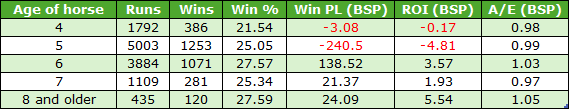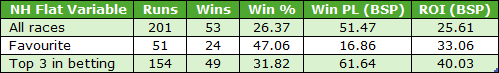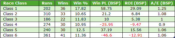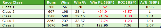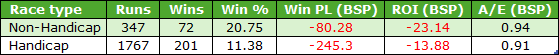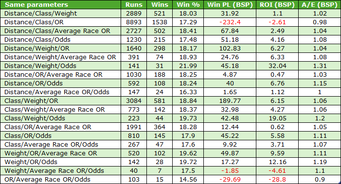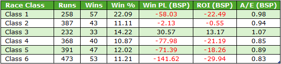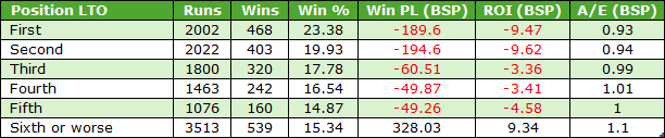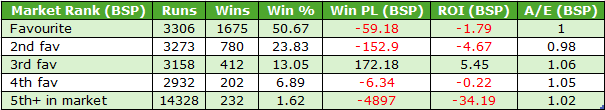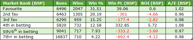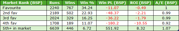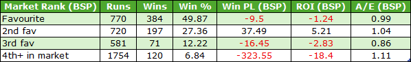 Front runners / horses that contested the early lead had an outstanding record when favoured by the market. However, it's a different story for those favourites that raced mid pack or at the back early. As can be seen, the bias over this course and distance has been very strong indeed, but still it wasn't quite enough to make my top ten. Exciting times ahead, then!