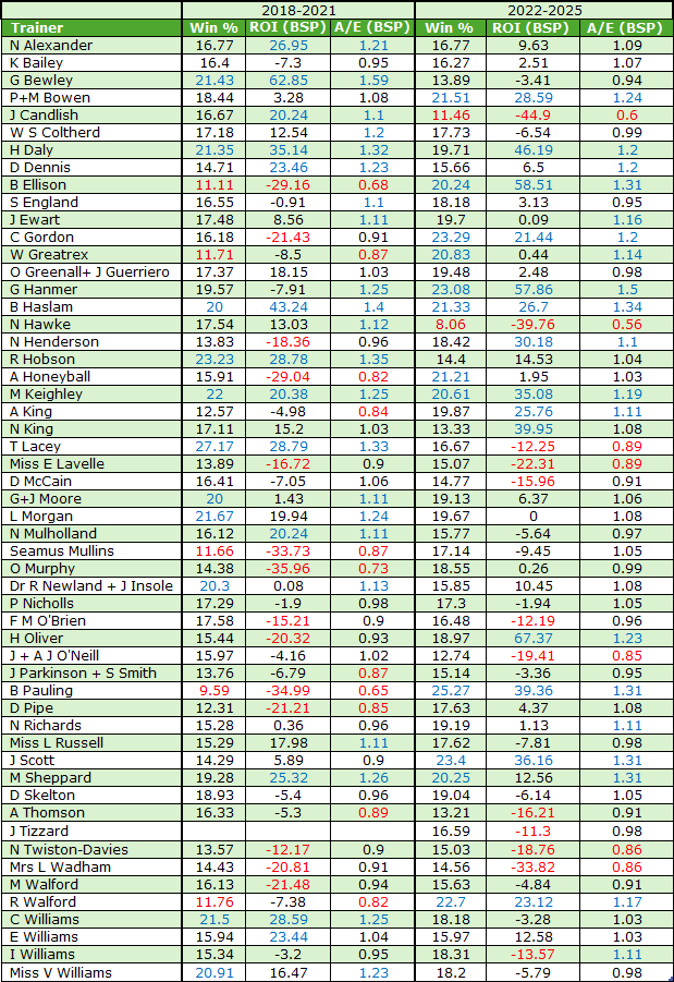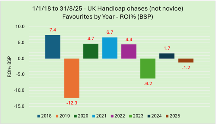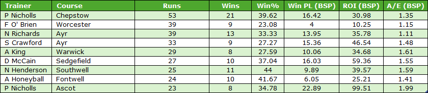 To compile my top picks, I have used data for handicap chases only as they are not so prone to distortion by the ability range of the horses competing. Data are from 2018 to 2024 with no minimum runner consideration.