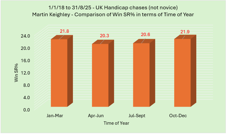 Strong figures again for front runners, although this is another course and distance (C&D) where qualifying races were relatively infrequent (only four races per year on average). Indeed, at the time of writing there has been just one qualifying handicap chase in 2025, but it was won by the early leader as we can see: