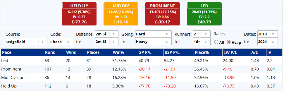 I mentioned in a recent offering that Gold members of Geegeez have so many benefits and one of these is access to the Pace Analyser. This allows users to dive into run style / pace biases at any racecourse in the UK and Ireland. The data can be filtered based on going, field size, distance and race type. There is also the option to separate hurdles and chase (and NH Flat) data at jumps courses; and across all courses the data can further be filtered by year to allow for possible changes in any bias. The Pace Analyser is ideal for research such as this, and it was the main source that I used to produce what follows.