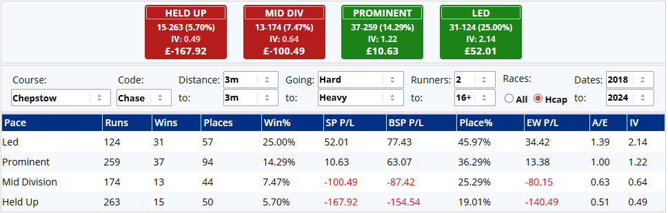 Some readers may expect front runners to be at a disadvantage over longer distances in handicap chases: surely for a horse to lead from start to finish in a 3-mile race would not be any easy assignment, right? However, looking at the Chepstow breakdown I suspect might change a few minds!