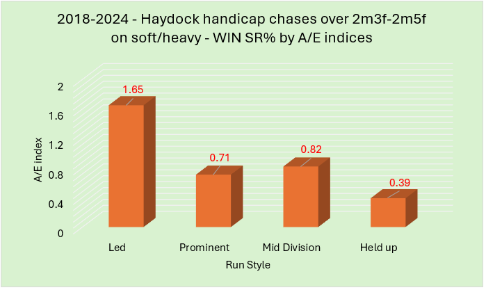 Haydock, like Sandown, has seen the front running bias strengthen on softer ground. On soft or heavy the run style win strike rates were as follows: