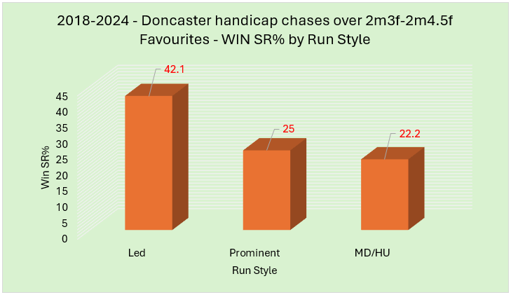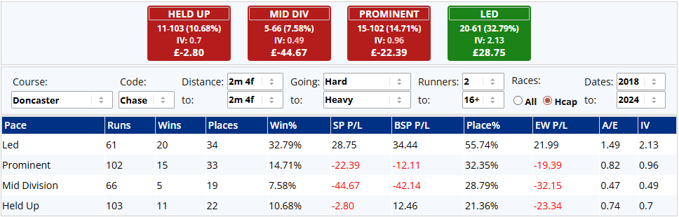 Front runners have won 20 of the 51 races and have an excellent placed record to boot. The ground is rarely testing at Doncaster, but on good to soft or softer the bias does seem to get even stronger: