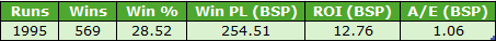 This is a good time to note that not all run style groups have the same number of runners; there are always going to be far more hold up horses than front runners / early leaders. However, despite the ‘led’ group having just 82 qualifiers compared with the held-up group of 161, they have still won 20 races compared with 15. The Win%s in the table show the strike rate within each run style group, and for this article that is how I will quantify ‘win strike rate’.
