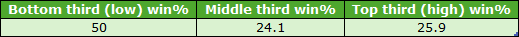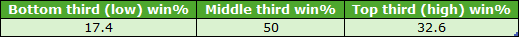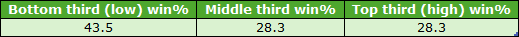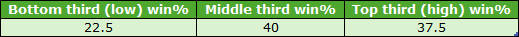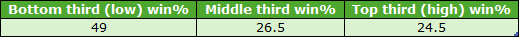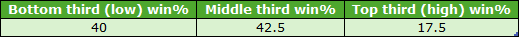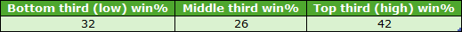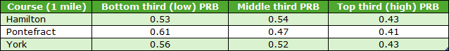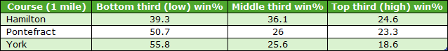 Over the 1-mile trip the C&Ds that passed my two earlier rules were Hamilton, Pontefract and York. Their draw third win splits for qualifying 1m handicaps (7+ runners) were as follows: