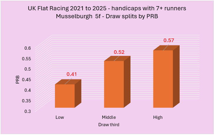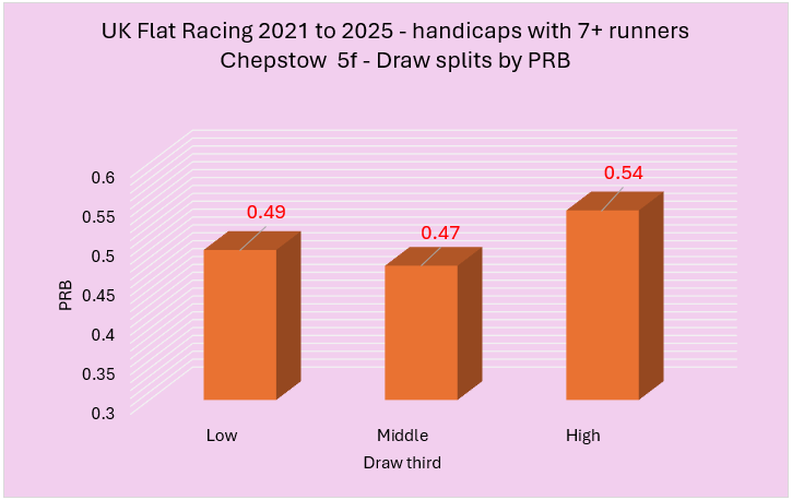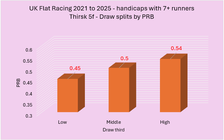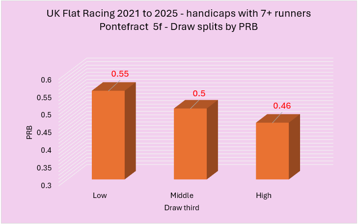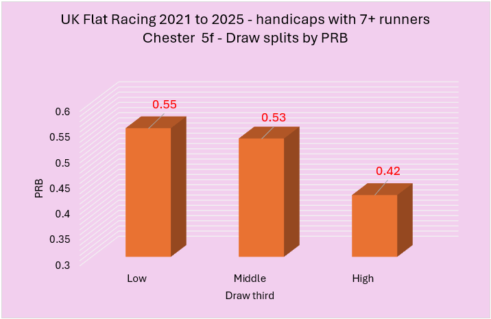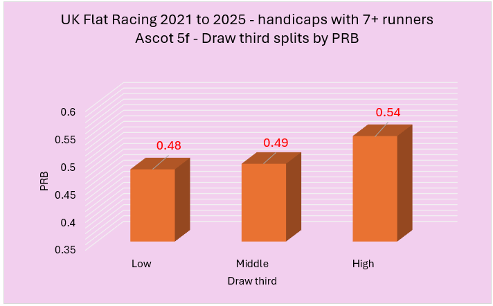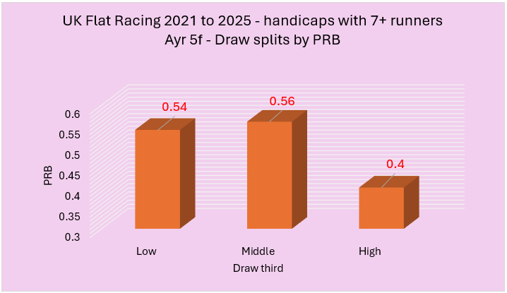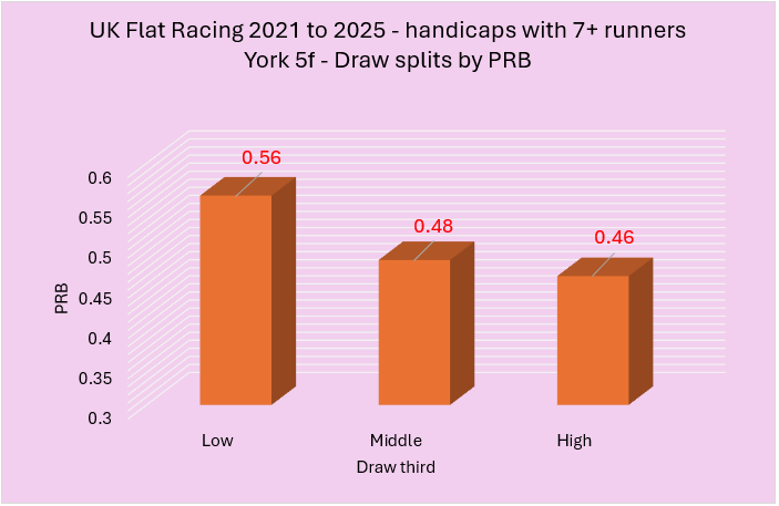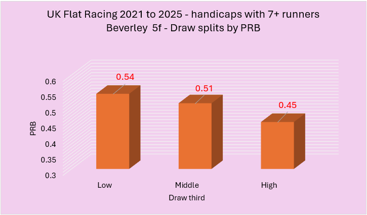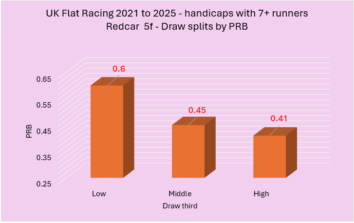 Last week I highlighted a variety of courses that had shown an apparent draw bias over 5f in handicaps between 2021 to 2025. From this initial group of courses, I wanted to try and establish those with the strongest biases. I did this using two rules. The first rule was that the disadvantaged third of the draw needed to have a win percentage of below 25% coupled with a PRB figure of 0.48 or lower. The second involved a simple calculation of multiplying the win strike rate percentage of the disadvantaged third of the draw by its PRB with only the lowest scoring courses making the cut. I felt this was a fair way to do it and, essentially, I needed to use some sensible parameters to establish what were likely to be the strongest biases.