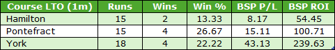 All three in profit, albeit again the sample sizes are very small. One course over 1 mile that just failed to pass my two rules was Redcar. For the record, applying the NDB system to this LTO C&D would have yielded five winners from 25 producing a return of 26p in the £.