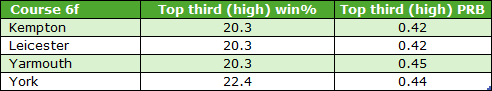Finally, I looked at the strongest 6f biases to see which C&Ds qualified for the NDB system. Four passed my rules namely Kempton, Leicester, Yarmouth and York. For all four it was the higher draws that performed poorly. Here are their top third win percentages and PRBs: