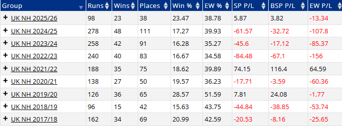 Below for example I've selected the trainer Anthony Honeyball, whose yard geegeez.co.uk sponsors and with whom we syndicate a number of horses, and 'grouped by' season (having only selected UK and NH race types - Anthony has also had flat winners and winners in Ireland during this time).