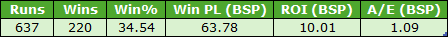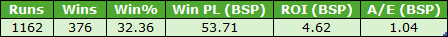 We have a positive starting point with a blind profit to BSP. I guess punters and perhaps bookmakers may feel that a horse that has not been favourite before after at least 10 career starts may be a slightly false favourite, and hence the price ends up slightly higher than its true price. The BSP A/E of 1.04 supports such an assertion.