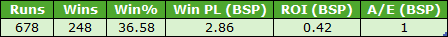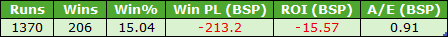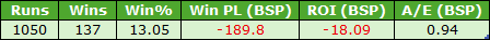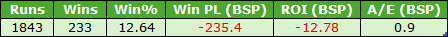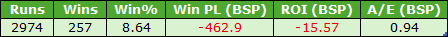 I also looked at the same ‘finishing third or worse’ idea for this cohort, in terms of finishing positions when favourites on both of their previous two starts. The results were poor as I guess we should expect. This group of runners managed just 78 wins from 745 runners (SR 10.5%) for hefty losses of £155.29 (ROI – 20.9%). This included a BSP win at 66.10, so take that out and losses would have been far worse.