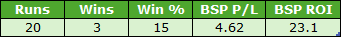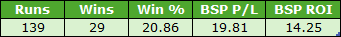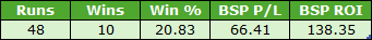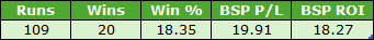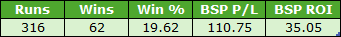 It's another smallish sample despite combining three more courses, but also another very profitable one. There was a winner priced BSP 35.44 so after commission that effectively accounted for half of the profits but even taking that out of the equation the figures would have been excellent.