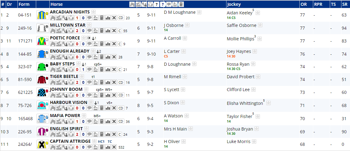 Arcadian Nights and Poetic Force bring the best form to the table as both won last time out and they are two from three and three from six respectively. Captain Attridge is a career 0 from 5, but the rest of the field have all won at least one of their last six outings.