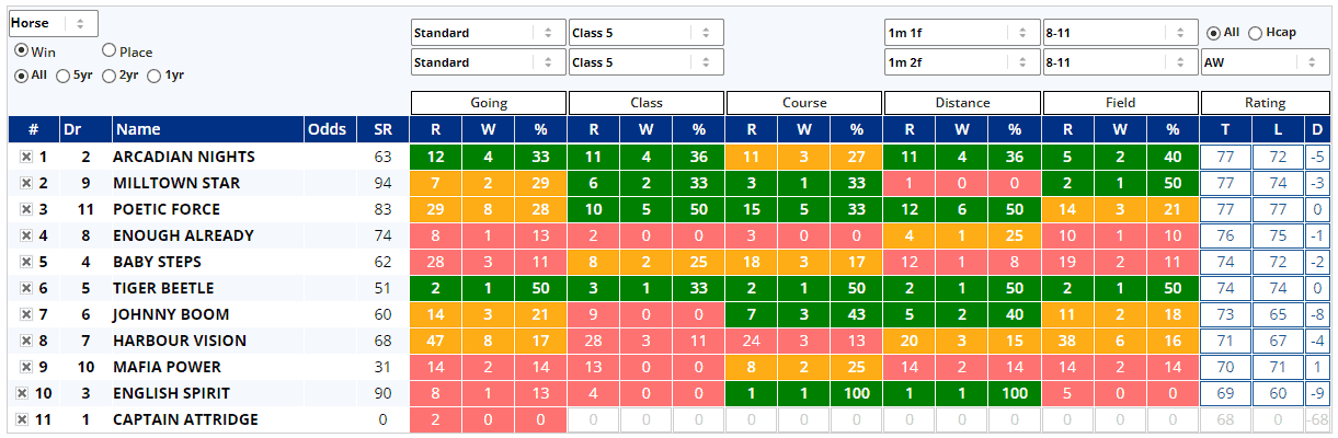 All bar Captain Attridge have won on standard going A/W tracks with varying degrees of success and we've half a dozen previous Class 5 A/W winners, according to Instant Expert...