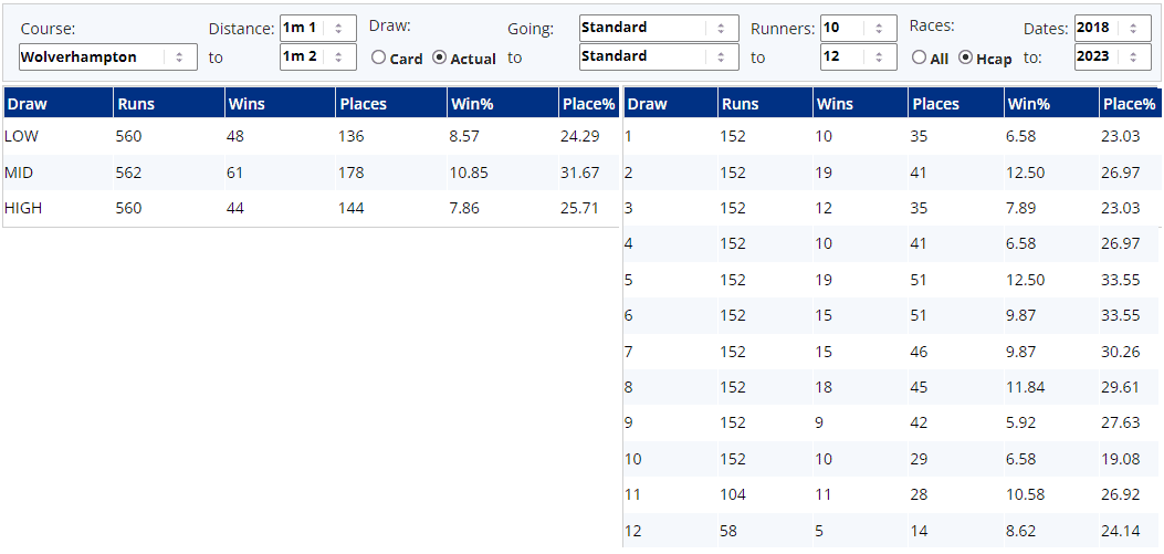 ...but the stall by stall analysis doesn't entirely back this up, so I wouldn't be too concerned about where my horse was drawn and I'd be more interested in race tactics. And we look against at those 1600+ runners above, the key here is not to dwell early and get left behind...