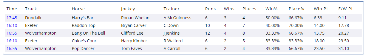 ...and of the two favourites, I'd prefer Cedar Row based on the evidence from Instant Expert, even if Bells did win last time out and will race further forward. That said, I'm not rushing to back either at those prices. In fact I'd be more interested in small E/W plays on Chloe's Court and Striking A Pose. The latter won here last time out and has made the frame in three of his last five and five of his last eight, whilst the former was a runner-up here over course and distance and has finished 1142 in her last four outings.