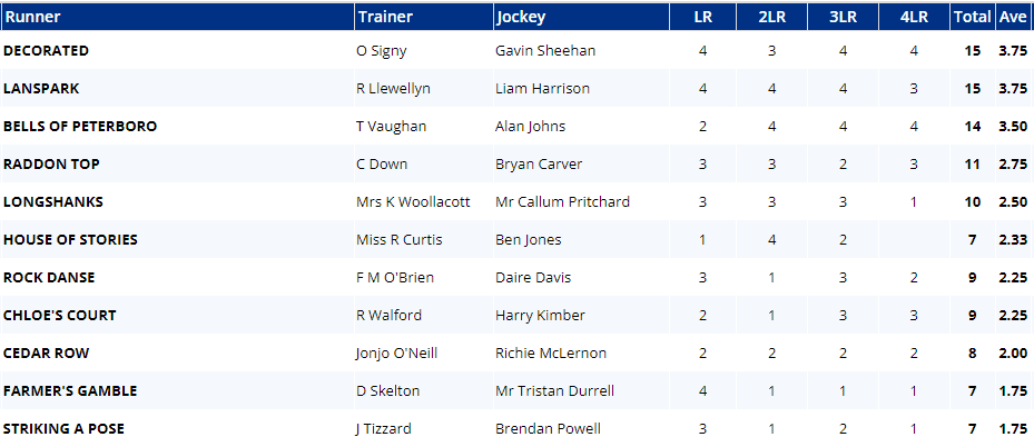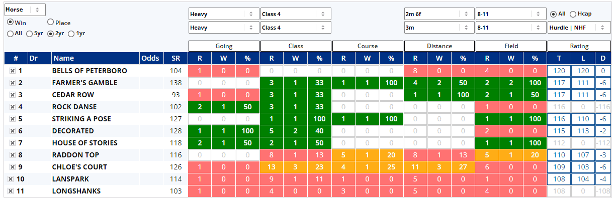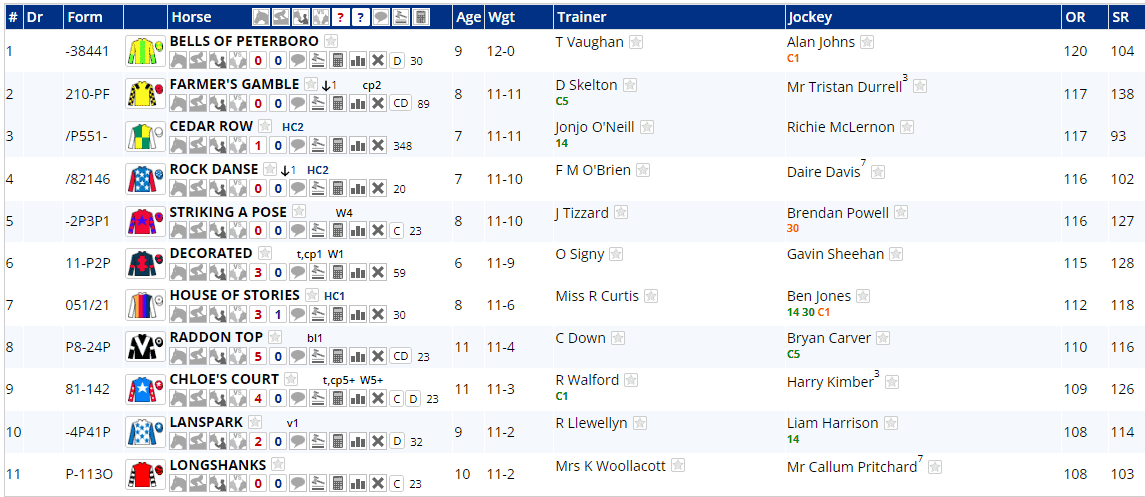 Top-weight Bells of Peterboro, Cedar Row, Striking A Pose and House of Stories all won last time out, but Farmer's Gamble, Decorated, Raddon Top and bottom weight Longshanks all failed to finish. That last pair of Raddon Top and Longshanks are the only ones without a win in their last five outings or more, having tasted defeat in seven and nine on the bounce respectively.