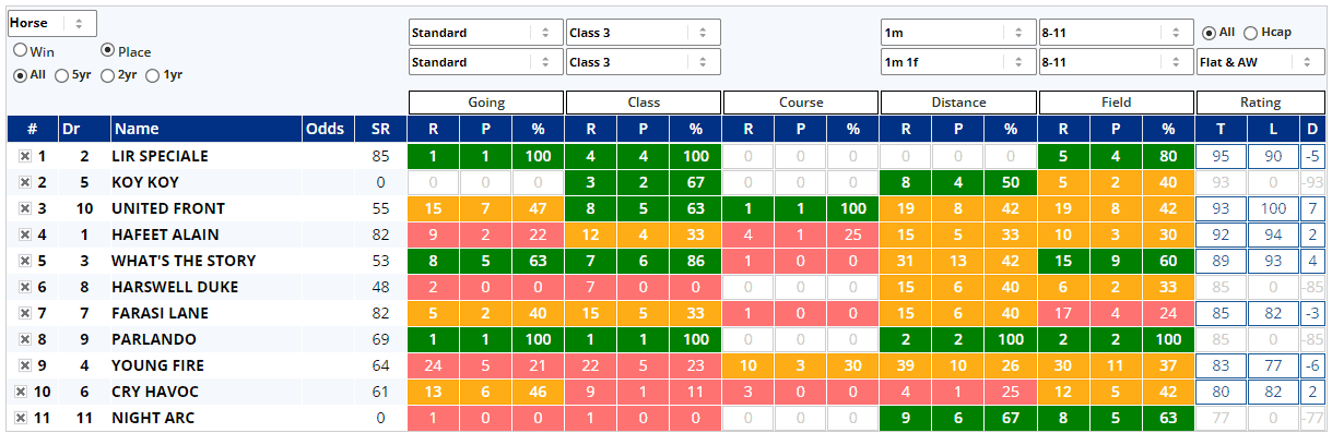 Not a lot to crow about there, but Lir Speciale is proven in this grade, whilst Hafeet Alain looks generally weak in this context. What's The Story and Young Fire have struggled on standard going with the latter also not faring too well at Class 3, although the former's place stats are far better. Perhaps he's more of a placer than a winner?
