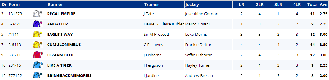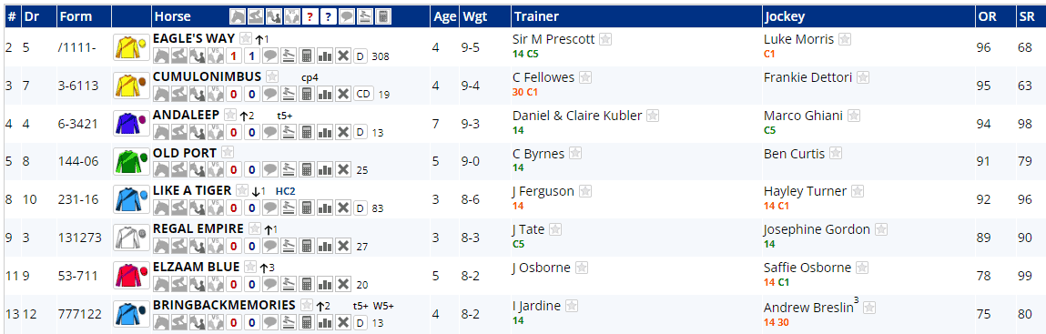 Andaleep won last time out, Elzaam Blue comes here on a hat-trick and Eagles Way has won his last four! Like A Tiger has won two of his last three, as has Cumulonimbus who has four wins and two places from his last seven outings.
