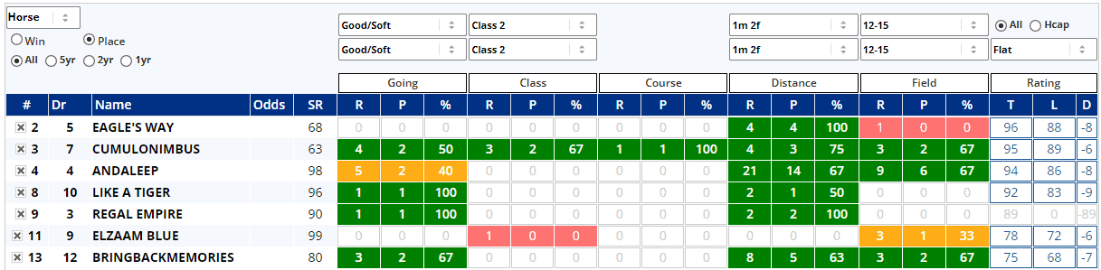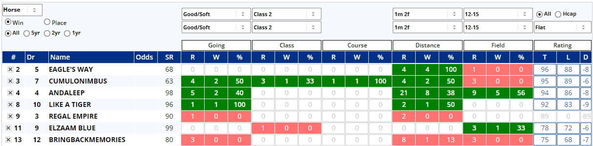 Eagle's Way is 2 from 2 on good ground and 2 from 2 on good to firm, but hasn't raced on good to soft and was only 8th of 15 when beaten by 9 lengths over 7f on soft ground when making his debut in October 2021. He makes a Class 2 debut after 2 wins at Class 3 and 2 at Class 5, but will certainly get the trip. Cumulonimbus has a line of green albeit off a small number of relevant races, but Andaleep is proven at this trip. Bringbackmemories looks the weakest on those win stats, particularly with 7 defeats from 8 at this trip. Perhaps, his place stats will make him look better...