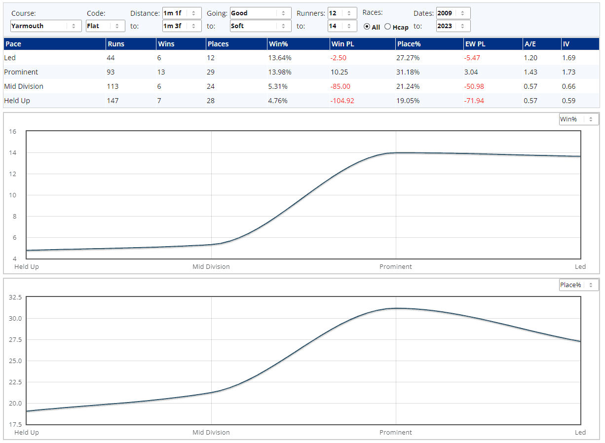 ...which keeps the other six runners in with a shout. Those 30+ races I used for the draw stats have, like many a Yarmouth race, tended to be won by those setting or closely tracking the pace...