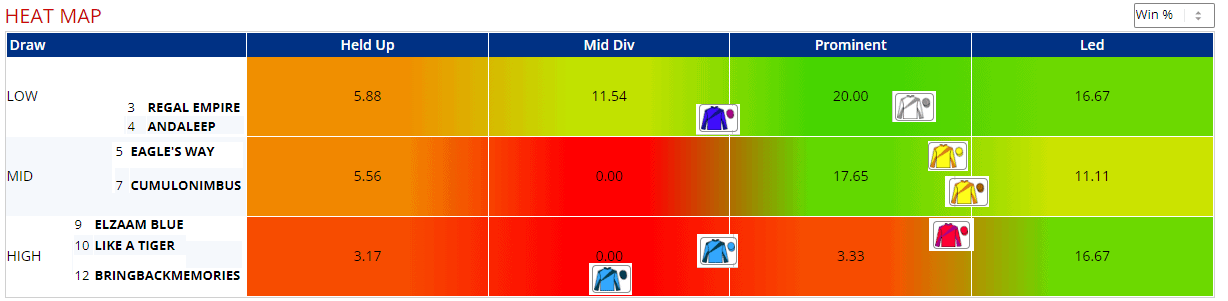 I've used a process of elimination up to the draw stats, which I think eliminate Bringbackmemories from my enquiries, a decision backed up by his pace stats and the subsequent heat map. The heat map also suggests that Like A Tiger might struggle here, but if Elzaam Blue races like he did two, three and four starts ago, he could still be in with a shout.
