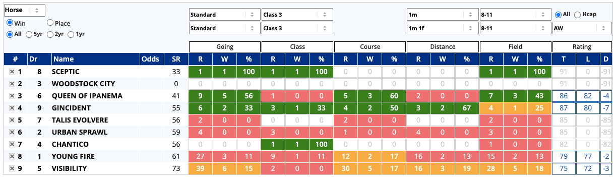 COURSE/DISTANCE WINS : Queen of Ipanema has won here over 1m1½f and 1m4f, but Gincident, Young Fire and Visibility are all former course and distance winners and all these course wins are shown below in Instant Expert...