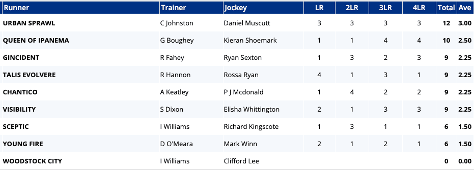 FORM : No LTO winners, but Woodstock City, Talis Evolvere and Urban Sprawl were placed, but the latter is winless in his recent form-line, as is Young Fire. Woodstock City, Queen of Ipanema, Gincident and Visibility have all won two from their last six.