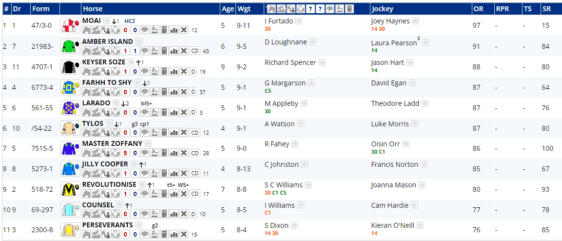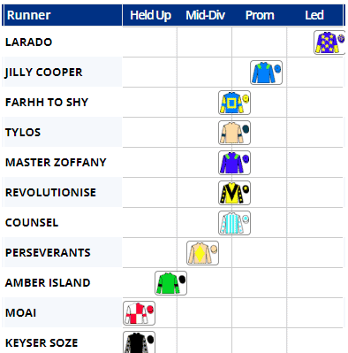 And as well as expecting a close market, the 2nd to 8th runners in the weights will only have a 3lb spread with two of them coming here off the back of a win last time out : Keyser Soze and Jilly Cooper. Of the rest, only Amber Island, Larado, Master Zoffany and Revolutionise have a win in their visible form line, although Tylos has been a runner-up in each of his last two.