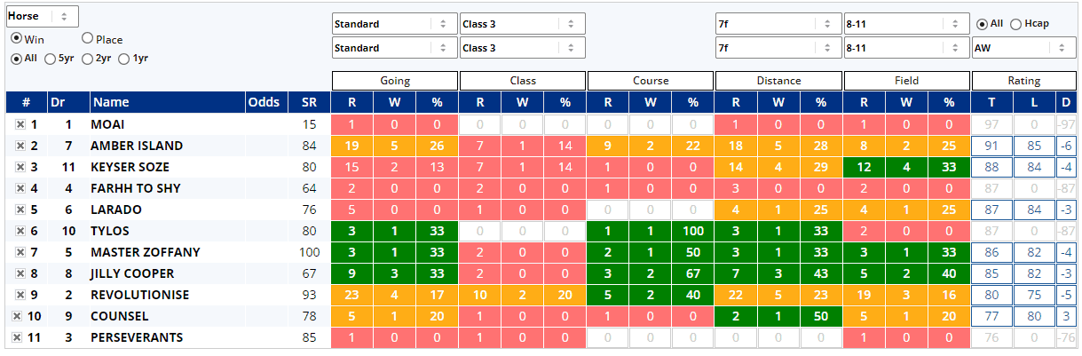 Amber Island returns from the longest break, but shouldn't have got too rusty in a 6-week rest, whilst Larado is pitched back in three days after a Listed race and 8 of the 11 have raced in the last 20 days. We know that most of these have won at today's trip, but not many have scored at Class 3 on the A/W, according to Instant Expert...