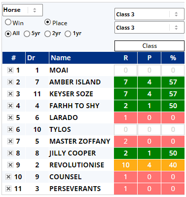 ...somewhat (if not totally) allaying my fears about both Amber Island & Keyser Soze only having 1 from 7 records at Class 3. Elsewhere Amber Island was third over C&D LTO and remains 6lbs higher than her last win, four starts ago, whilst Revolutionise (who looks solidly if unspectacularly consistent on IE) is 5lbs higher than his last win. The ones obviously catching the eye from above are Tylos, Master Zoffany and Jilly Cooper, three of our course and distance winners.